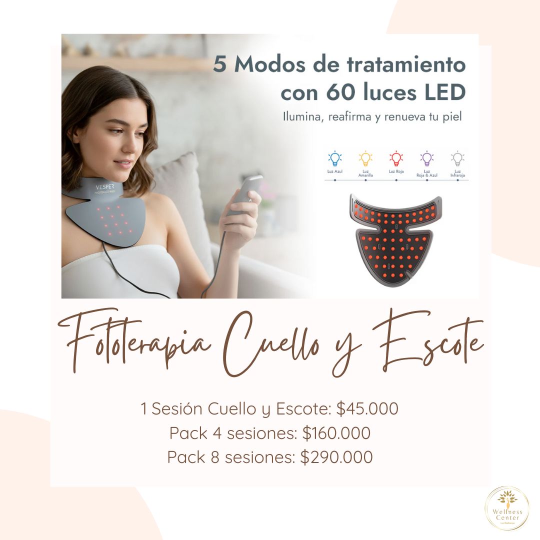 La Fototerapia en cuello y escote utiliza luz LED para rejuvenecer la piel, tratando manchas, arrugas finas, flacidez y mejorando la textura, estimulando la producción de colágeno y elastina, ofreciendo resultados no invasivos y seguros para un aspecto más uniforme y terso.