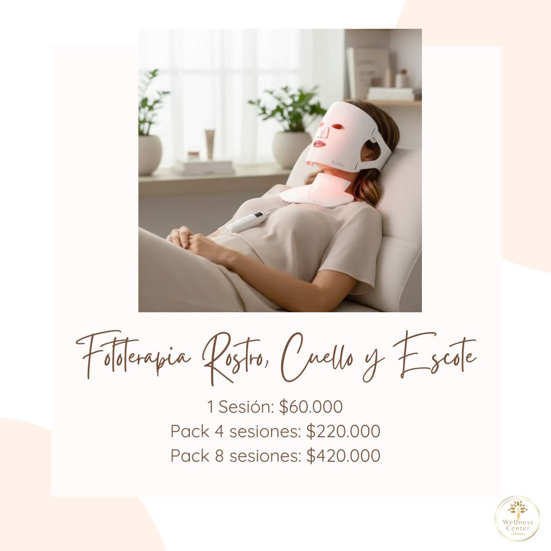 La Fototerapia en cuello y escote utiliza luz LED para rejuvenecer la piel, tratando manchas, arrugas finas, flacidez y mejorando la textura, estimulando la producción de colágeno y elastina, ofreciendo resultados no invasivos y seguros para un aspecto más uniforme y terso.